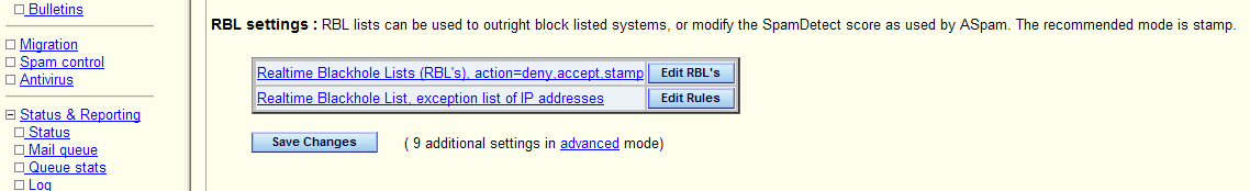 g_orbs_list name="zen.spamhaus.org" action="deny" stamp="Your ip is listed in the spamhaus RBL http://www.spamhaus.org" g_orbs_list name="bl.spamcop.net" action="stamp" stamp="Listed in SPAMCOP"